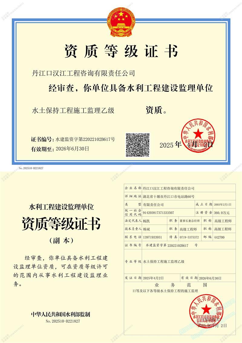 (原漢江綜合開發公司水利水電監理中心)成立于 1989年3月,1993年6月經水利部審批成為首批注冊監理單位 (隸屬于長江水利委員會), 注冊資本 360萬元 。公司位于湖北省十堰市丹江口市電站路。公司目前擁有水利部頒發的 水利工程施工監理甲級 、 水土保持工程施工監理 乙 級 資質 ;住建部頒發的 房屋建筑 、 市政公用工程監理 乙 級資質 。 可獨立承擔 各類水利水電工程 、 一般工業與民用建筑工程監理 , 土地整治 , 招標代理 、 技術咨詢 等業務。公司實行董事會領導下的總經理負責制,下設辦公室、經營部、財務部、工程技術部等職能部門?!?/span>
